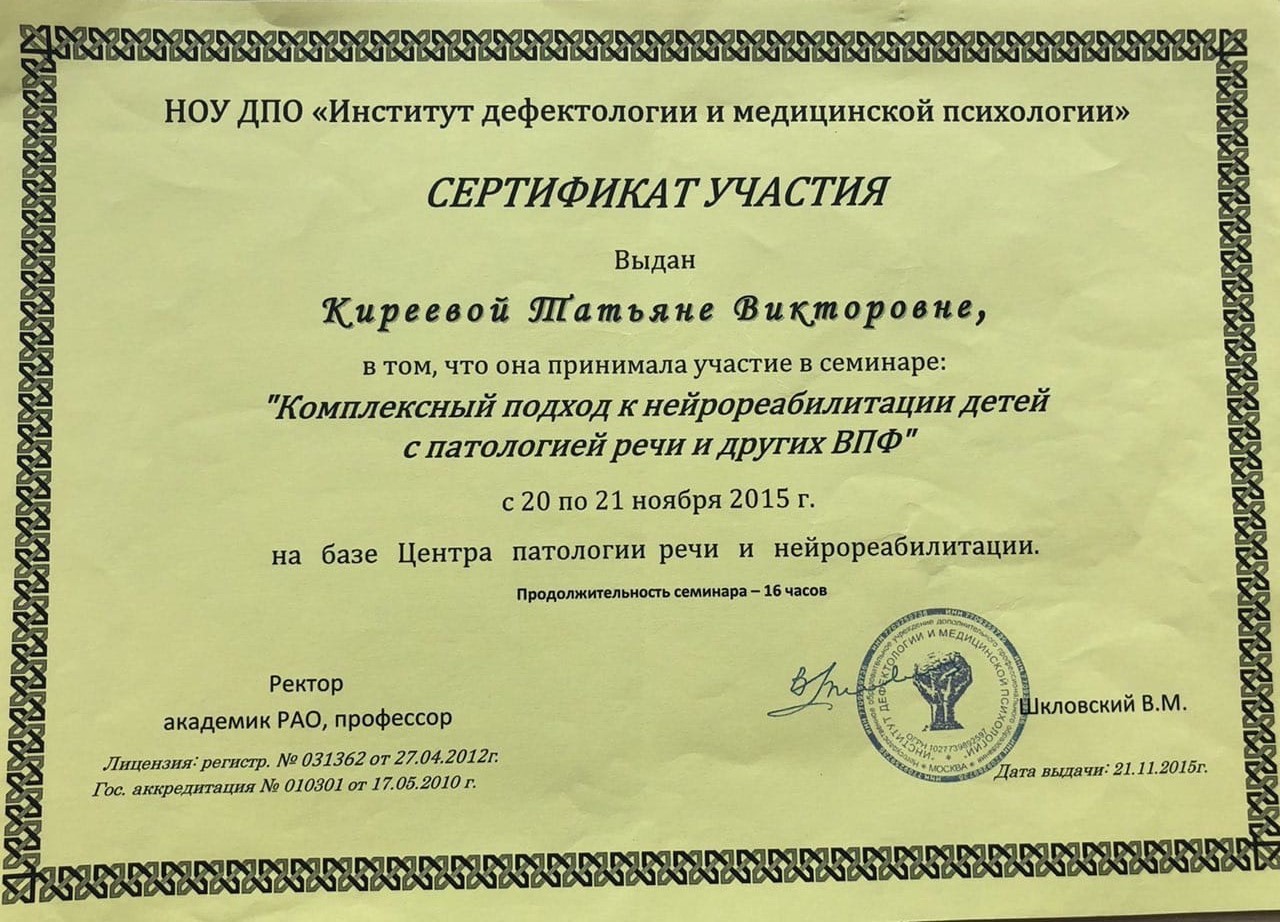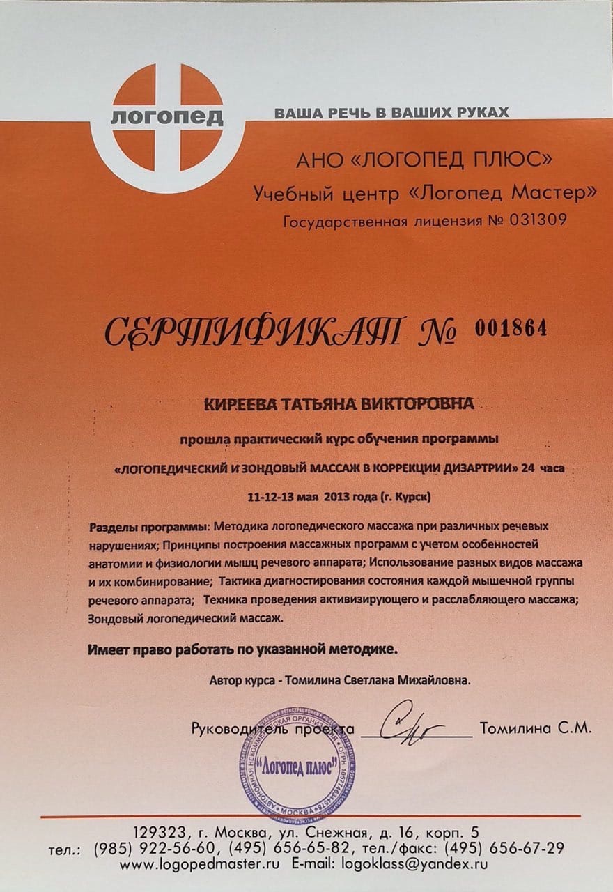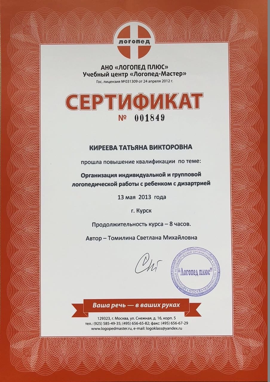 Основное направление работы — это коррекция и компенсация имеющихся у ребенка отклонений в развитии, предупреждение и преодоление вторичных отклонений в речевом, психическом и физическом развитии, нарушения интеллекта, адаптация и социализация ребенка в обществе. Образование высшее. Курский государственный университет, дефектологический факультет.